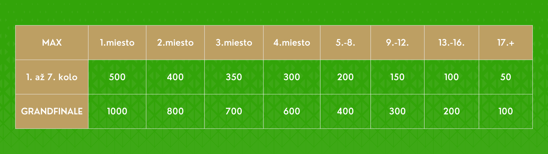 - Zbieraš body z každého turnaja a ligy podľa toho, na ktorom mieste sa umiestniš